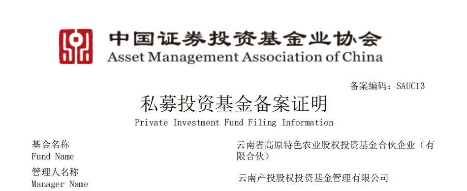 云南省高原特色農(nóng)業(yè)高質(zhì)量發(fā)展基金正式注冊并完成備案