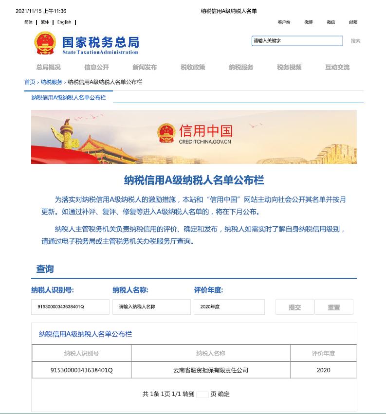 ?近日,國家稅務(wù)總局“納稅信用A級(jí)納稅人名單公布欄”公布了2020年度A級(jí)納稅人名單,集團(tuán)旗下云南省融資擔(dān)保有限責(zé)任公司(以下簡(jiǎn)稱公司)獲評(píng)納稅信用A級(jí)企業(yè)。