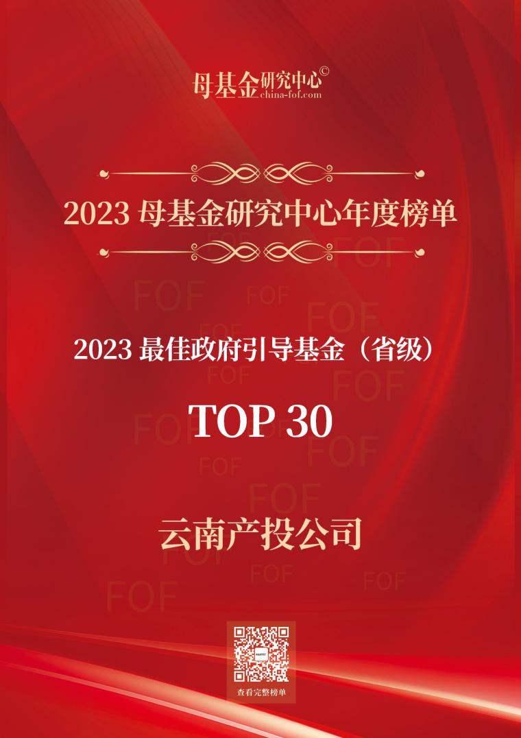 2023年12月11日,中國母基金研究中心正式發(fā)布2023年度榜單,集團(tuán)所屬云南產(chǎn)投公司榮登“2023最佳政府引導(dǎo)基金(省級)Top 30”榜單,這是公司連續(xù)三年榮獲該獎項。
