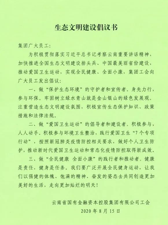 2020年8月15日,是習(xí)近平總書記提出“綠水青山就是金山銀山”理念15周年的日子。集團工會以此為契機,在海埂大壩組織開展了以“全民健康 全民小康”為主題的健步走活動,發(fā)起生態(tài)文明建設(shè)倡議,鼓勵和引導(dǎo)集團廣大員工參與體育健身活動,提高身體素質(zhì),人人參與愛國衛(wèi)生運動。集團領(lǐng)導(dǎo)和集團本部員工積極參與了此次活動。