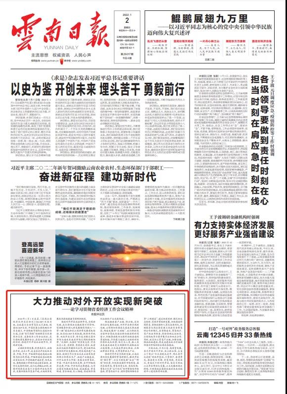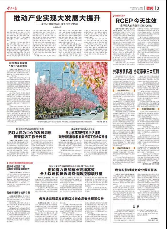 2022年1月1日凌晨,《區(qū)域全面經濟伙伴關系協(xié)定》(RCEP)生效實施,全球最大自由貿易區(qū)正式啟航。隨著RCEP生效、中國東盟全面戰(zhàn)略伙伴關系建立、中老鐵路等國際大通道加快打通,云南“東引西聯(lián)”的獨特區(qū)位優(yōu)勢更加凸顯。省委經濟工作會議指出,我們要統(tǒng)籌發(fā)展和安全,在堅決守好邊境的同時,推進對外開放邁出新步伐、實現(xiàn)新突破。