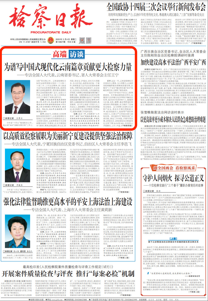 3月4日,《檢察日?qǐng)?bào)》頭版刊發(fā)文章《為譜寫中國(guó)式現(xiàn)代化云南篇章貢獻(xiàn)更大檢察力量——專訪全國(guó)人大代表,云南省委書記、省人大常委會(huì)主任王寧》。
