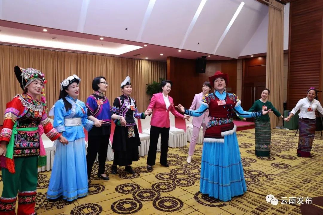 云南省代表團(tuán)30位女代表、9位女工作人員、2位女記者中有29名少數(shù)民族同志,大家身著絢麗的民族服裝共同慶祝自己的節(jié)日,成為一道靚麗的風(fēng)景線。女代表們一起唱起《唱支山歌給黨聽》等歌曲,歡樂的歌聲和燦爛的笑容充滿現(xiàn)場,傳遞著大家節(jié)日的喜悅心情和高漲的履職熱忱。