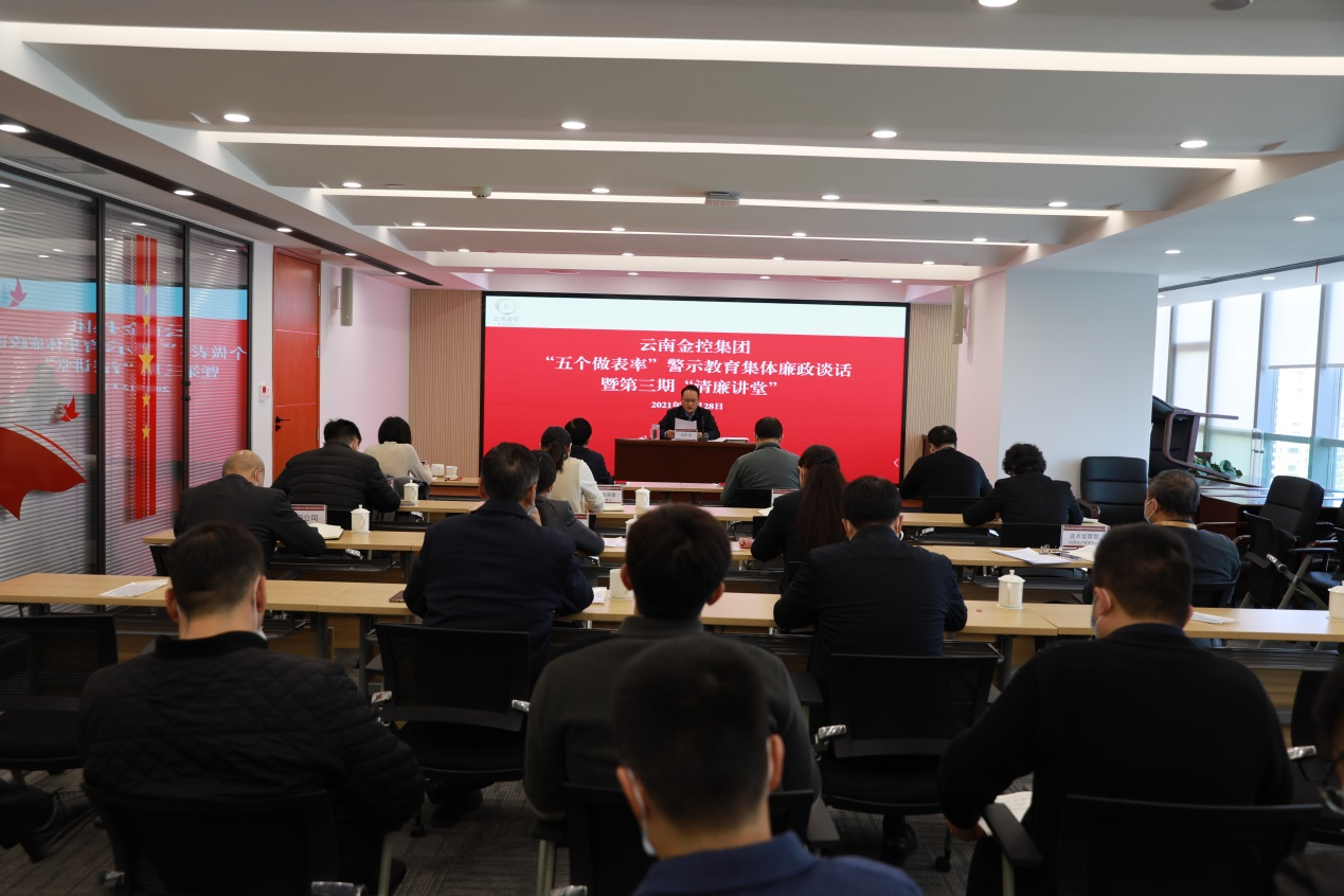 ? 云南金控集團(tuán)黨委認(rèn)真貫徹落實(shí)省委“五個(gè)作表率”專題學(xué)習(xí)教育工作要求,把開展以案促改警示教育和集體廉政談話作為落實(shí)“五個(gè)作表率”專題學(xué)習(xí)教育的具體行動(dòng)和重要抓手,持續(xù)構(gòu)建云南金控風(fēng)清氣正的政治生態(tài)。2021年12月28日,集團(tuán)黨委組織集團(tuán)領(lǐng)導(dǎo)班子成員、集團(tuán)中層管理人員開展“五個(gè)作表率”警示教育集體廉政談話暨第三期“清廉講堂”活動(dòng)。