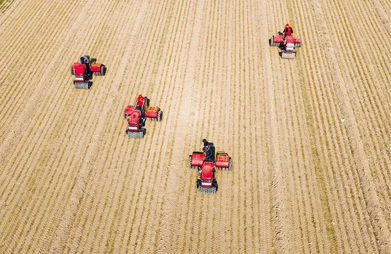 我國糧食安全保障能力持續(xù)提升,糧食生產(chǎn)實現(xiàn)“十九連豐”,總產(chǎn)量連續(xù)8年穩(wěn)定在1.3萬億斤以上。圖為2023年2月4日,在山東省聊城市東昌府區(qū)斗虎屯鎮(zhèn)楊廟村,運興農(nóng)機專業(yè)合作社的員工駕駛著鎮(zhèn)壓機械為托管的冬小麥進行鎮(zhèn)壓控旺長保墑情作業(yè)。 人民圖片 張振祥/攝
