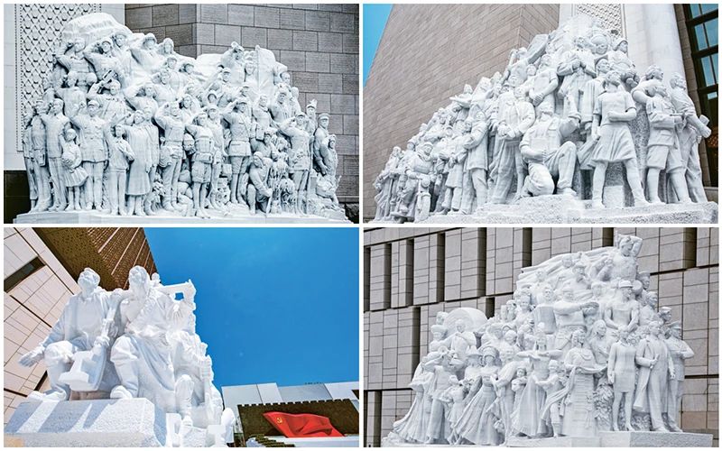 中國共產(chǎn)黨歷史展覽館西側(cè)廣場上矗立的《信仰》、《偉業(yè)》、《攻堅(jiān)》、《追夢》四組大型雕塑,莊重巍然、充滿力量,講述著中國共產(chǎn)黨團(tuán)結(jié)帶領(lǐng)全國各族人民艱苦奮斗、不懈奮斗的歷程。圖為四組大型雕塑拼版照片。 劉新武/攝