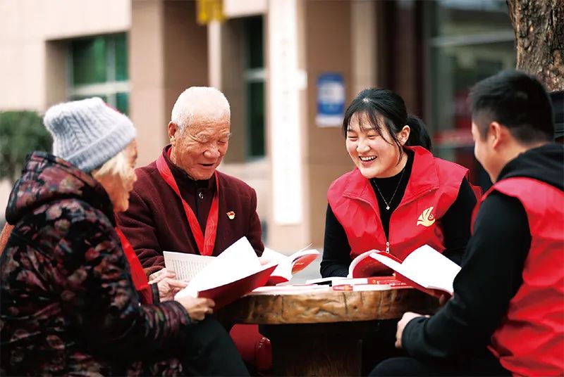 圖為2022年11月18日,山東省臨沂市郯城縣郯城街道“90后”青年黨員志愿者與龍泉社區(qū)“40后”老黨員一起學(xué)習黨的二十大精神。人民圖片 張春雷/攝