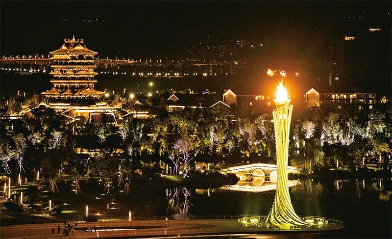 2023年7月28日晚,第31屆世界大學(xué)生夏季運(yùn)動(dòng)會(huì)開幕式在成都東安湖體育公園主體育場舉行。這是成都大運(yùn)會(huì)主火炬。 新華社記者 曹祎銘/攝