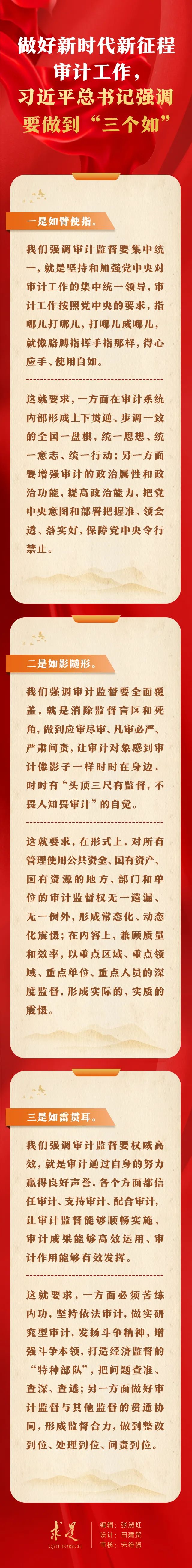 11月1日出版的第21期《求是》雜志刊發(fā)習(xí)近平總書記重要文章《在二十屆中央審計(jì)委員會(huì)第一次會(huì)議上的講話》。在這篇重要文章中,習(xí)近平總書記指出:“做好新時(shí)代新征程審計(jì)工作,總的要求是在構(gòu)建集中統(tǒng)一、全面覆蓋、權(quán)威高效的審計(jì)監(jiān)督體系,更好發(fā)揮審計(jì)監(jiān)督作用上聚焦發(fā)力,具體要做到‘三個(gè)如’?!?