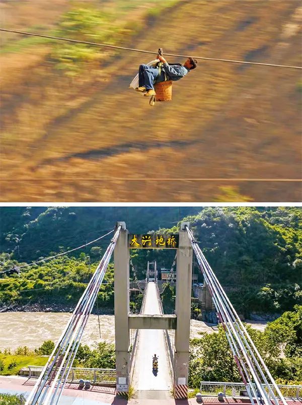 ?“過江靠溜索”曾是怒江兩岸群眾出行的重要方式。2013年,國家實(shí)施“溜索改橋”項(xiàng)目,幫助西部邊遠(yuǎn)山區(qū)群眾結(jié)束溜索時(shí)代,怒江州怒江段上溜索被改造為各式跨江橋梁,完成了沿江人民“天塹變通途”的企盼。上圖為2013年2月2日,在云南省怒江州瀘水市六庫街道,一名居民背著背簍溜索過江(新華社記者 王長山/攝)。下圖為2022年9月13日,瀘水市居民騎摩托車通過大興地橋(無人機(jī)照片,新華社記者 江文耀/攝)。
