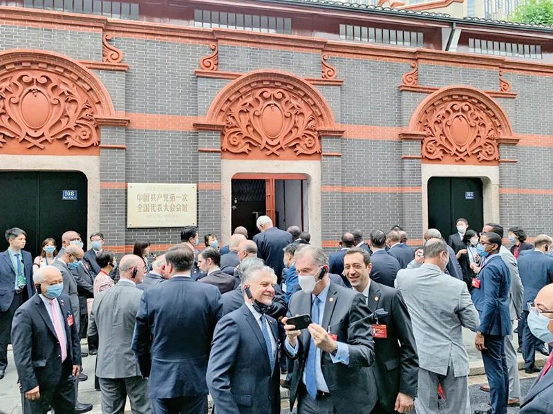 2021年6月16日,“中國(guó)共產(chǎn)黨的故事——習(xí)近平新時(shí)代中國(guó)特色社會(huì)主義思想在上海的實(shí)踐”特別對(duì)話會(huì)在上海舉行。近100個(gè)國(guó)家、126個(gè)政黨和友好組織的740多名代表通過(guò)視頻連線參加對(duì)話會(huì),40多個(gè)國(guó)家駐華大使現(xiàn)場(chǎng)出席會(huì)議。圖為與會(huì)駐華使節(jié)參觀中共一大會(huì)址。 人民網(wǎng) 馬作鵬/攝