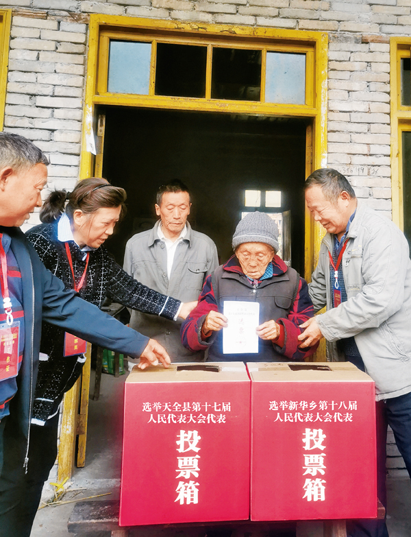 從2021年上半年起,全國縣鄉(xiāng)兩級人大換屆選舉陸續(xù)展開。就在中央人大工作會議結(jié)束后的第二天,四川省雅安市天全縣新華鄉(xiāng)永安村8組的106歲老人李朝蘭,迎來了她人生中的第18次換屆選舉投票——這一天,她依法行使自己的權(quán)利,為產(chǎn)生新一屆縣鄉(xiāng)兩級人大代表投出寶貴一票。圖為李朝蘭老人鄭重投出選票。 全國人大常委會供圖 楊愛玲/攝
