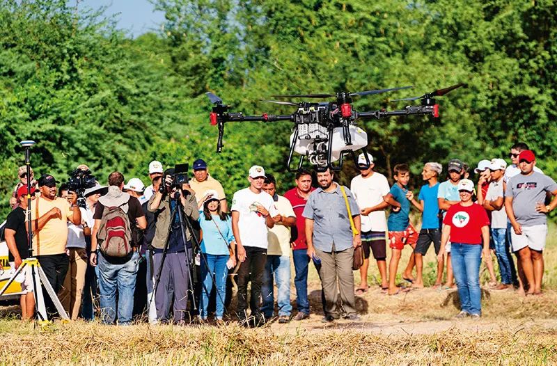 當前,經(jīng)濟全球化動力和阻力膠著,但動力仍然勝過阻力。中國呼吁各方攜手推動普惠包容的經(jīng)濟全球化,更好惠及不同國家、不同群體。圖為2024年2月2日,在巴西阿波迪舉行的中巴農業(yè)機械化合作示范項目啟動儀式上,人們觀看一款中國生產的農用無人機。?新華社記者 王天聰/攝