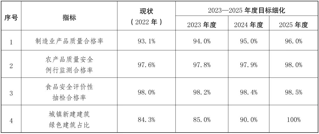到2025年,新產(chǎn)品、新業(yè)態(tài)蓬勃發(fā)展,產(chǎn)品、工程、服務(wù)質(zhì)量水平顯著改善,制造業(yè)產(chǎn)品質(zhì)量合格率提高到96%,農(nóng)產(chǎn)品質(zhì)量安全例行監(jiān)測(cè)合格率達(dá)到98%以上,食品安全評(píng)價(jià)性抽檢合格率保持在98.5%以上,工程質(zhì)量抽查符合率不斷提高,城鎮(zhèn)新建建筑綠色建筑占比達(dá)到100%。