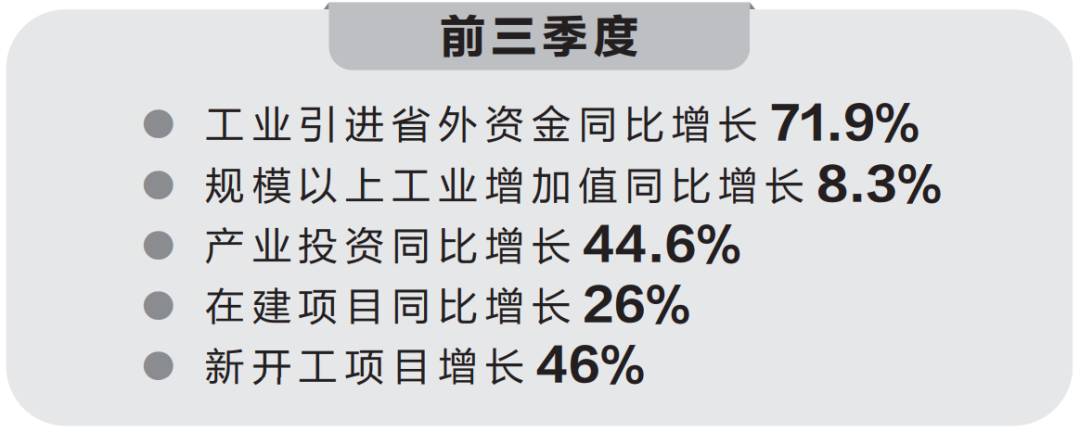 ?工業(yè)招大引強(qiáng)落地見效。全省上下圍繞優(yōu)勢(shì)資源、開放通道、延鏈補(bǔ)鏈強(qiáng)鏈狠抓招商,先后引進(jìn)正威集團(tuán)、廈門鎢業(yè)、中國(guó)五冶等重點(diǎn)企業(yè),一大批招商引資項(xiàng)目加快簽約落地,全產(chǎn)業(yè)鏈招商成效明顯。前三季度,全省引進(jìn)省外到位資金同比增長(zhǎng)24.2%,其中工業(yè)引資同比增長(zhǎng)71.9%,占全部引資的33.6%。