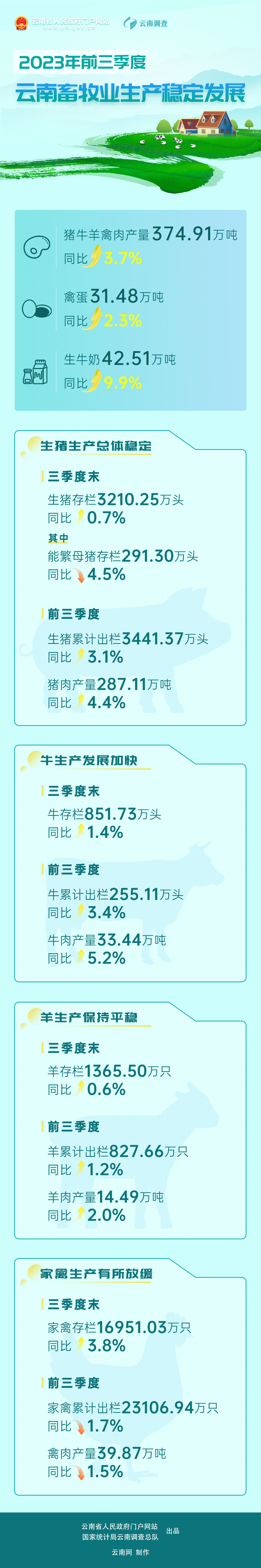 畜牧業(yè)生產(chǎn)穩(wěn)定發(fā)展。豬牛羊禽肉產(chǎn)量374.91萬噸,增長3.7%。其中,豬肉產(chǎn)量287.11萬噸,增長4.4%;牛肉產(chǎn)量33.44萬噸,增長5.2%;羊肉產(chǎn)量14.49萬噸,增長2.0%;禽肉產(chǎn)量39.87萬噸,下降1.5%。牛奶產(chǎn)量42.51萬噸,增長9.9%。禽蛋產(chǎn)量31.48萬噸,增長2.3%。三季度末,生豬存欄3210.25萬頭,增長0.7%;前三季度,生豬累計(jì)出欄3441.37萬頭,增長3.1%。