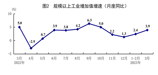一季度,全國規(guī)模以上工業(yè)增加值同比增長3.0%,比上年四季度加快0.3個百分點。分三大門類看,采礦業(yè)增加值增長3.2%,制造業(yè)增長2.9%,電力、熱力、燃氣及水生產(chǎn)和供應業(yè)增長3.3%。裝備制造業(yè)增加值增長4.3%,比1-2月份加快2.5個百分點。分經(jīng)濟類型看,國有控股企業(yè)增加值增長3.3%;股份制企業(yè)增長4.3%,外商及港澳臺商投資企業(yè)下降2.7%;私營企業(yè)增長2.0%。分產(chǎn)品看,太陽能電池、新能源汽車產(chǎn)量分別增長53.2%、22.5%。3月份,規(guī)模以上工業(yè)增加值同比增長3.9%,比1-2月份加快1.5個百分點;環(huán)比增長0.12%。3月份,制造業(yè)采購經(jīng)理指數(shù)為51.9%,企業(yè)生產(chǎn)經(jīng)營活動預期指數(shù)為55.5%。1-2月份,全國規(guī)模以上工業(yè)企業(yè)實現(xiàn)利潤總額8872億元,同比下降22.9%。