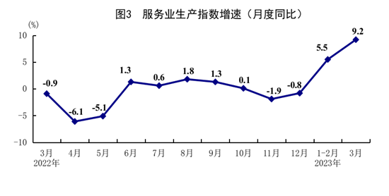 一季度,服務業(yè)增加值同比增長5.4%,比上年四季度加快3.1個百分點。其中,住宿和餐飲業(yè),信息傳輸、軟件和信息技術(shù)服務業(yè),金融業(yè),租賃和商務服務業(yè),批發(fā)和零售業(yè)增加值分別增長13.6%、11.2%、6.9%、6.0%、5.5%。3月份,全國服務業(yè)生產(chǎn)指數(shù)同比增長9.2%,比1-2月份加快3.7個百分點。其中,住宿和餐飲業(yè),信息傳輸、軟件和信息技術(shù)服務業(yè),交通運輸、倉儲和郵政業(yè)生產(chǎn)指數(shù)分別增長29.9%、12.0%、11.9%,比1-2月份分別加快18.3、2.7、7.7個百分點。1-2月份,規(guī)模以上服務業(yè)企業(yè)營業(yè)收入同比增長3.4%。3月份,服務業(yè)商務活動指數(shù)為56.9%,業(yè)務活動預期指數(shù)為63.2%。其中,零售、鐵路運輸、道路運輸、航空運輸、租賃及商務服務等行業(yè)商務活動指數(shù)高于60.0%。