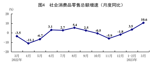 一季度,社會消費品零售總額114922億元,同比增長5.8%,上年四季度為下降2.7%。按經(jīng)營單位所在地分,城鎮(zhèn)消費品零售額99664億元,增長5.7%;鄉(xiāng)村消費品零售額15258億元,增長6.2%。按消費類型分,商品零售102786億元,增長4.9%;餐飲收入12136億元,增長13.9%?;旧铑惿唐蜂N售良好,限額以上單位服裝鞋帽針紡織品類、糧油食品類商品零售額分別增長9.0%、7.5%。升級類商品銷售大幅增長,限額以上單位金銀珠寶類、書報雜志類商品零售額分別增長13.6%、13.4%。全國網(wǎng)上零售額32863億元,增長8.6%。其中,實物商品網(wǎng)上零售額27835億元,增長7.3%,占社會消費品零售總額的比重為24.2%。3月份,社會消費品零售總額同比增長10.6%,比1-2月份加快7.1個百分點;環(huán)比增長0.15%。