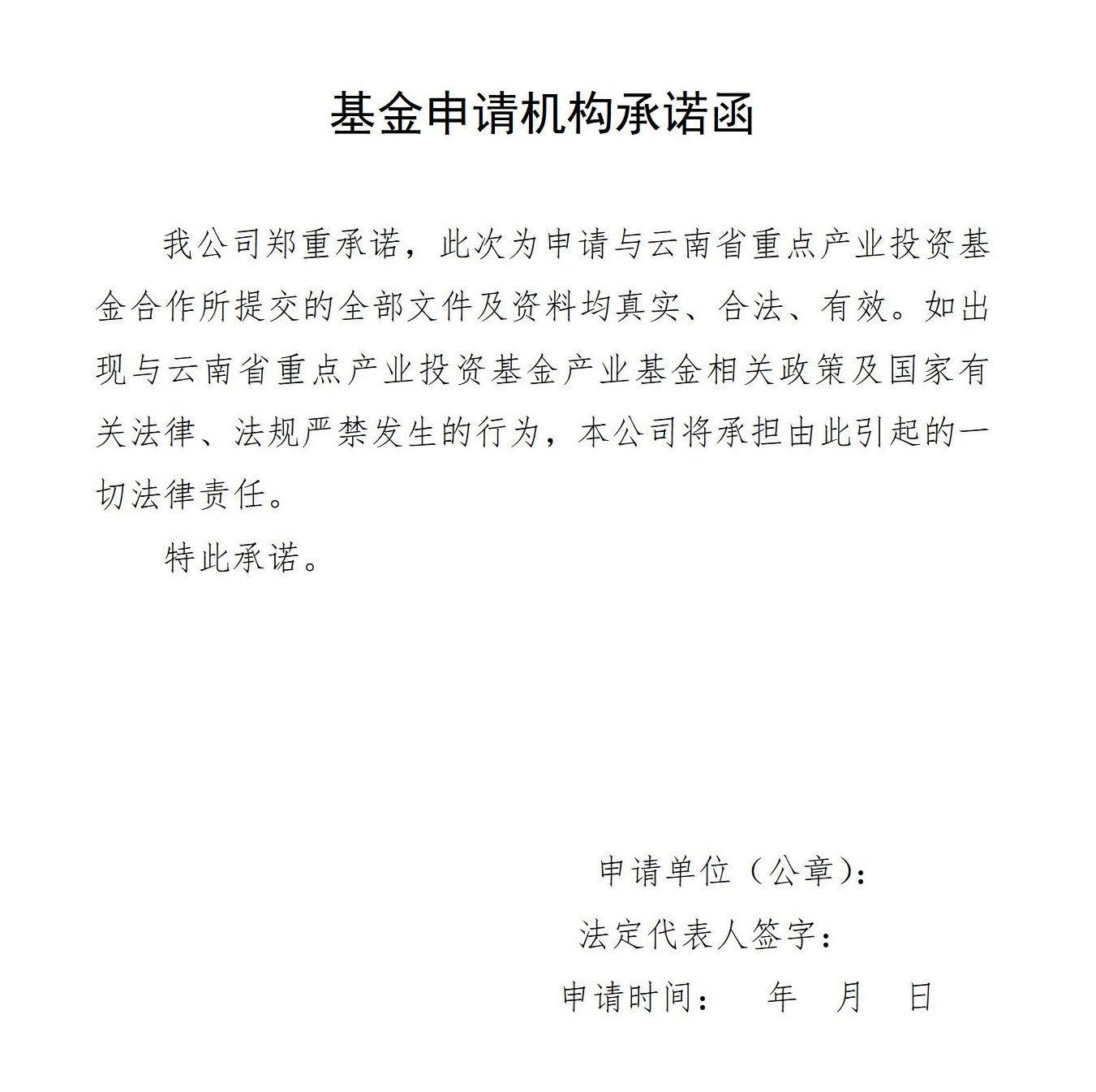 ? ? ??云南省重點產(chǎn)業(yè)投資基金由各行業(yè)主管部門、地方政府根據(jù)省委省政府的決策部署,結(jié)合各領(lǐng)域產(chǎn)業(yè)發(fā)展情況編制產(chǎn)業(yè)基金設(shè)立方案。產(chǎn)業(yè)基金申請機(jī)構(gòu)按照本申報指南要求進(jìn)行申報(模板見后)。產(chǎn)業(yè)基金申報采取遞交電子材料和紙質(zhì)材料相結(jié)合的方式。請申請機(jī)構(gòu)先將包括蓋章掃描版及word版的電子材料發(fā)送至官方郵箱(jjglb20212021@163.com),經(jīng)省重點基金管理人初審認(rèn)為無需補充的,再提交紙質(zhì)材料,紙質(zhì)材料需要正本1本和副本2本,正副本均需加蓋騎縫章。紙質(zhì)版郵寄至云南省產(chǎn)業(yè)投資基金有限責(zé)任公司(郵寄地址:云南省昆明市西山區(qū)人民西路云投財富商業(yè)廣場B1棟19層)。申請機(jī)構(gòu)對申請材料的合法性、真實性、有效性、一致性負(fù)完全責(zé)任。