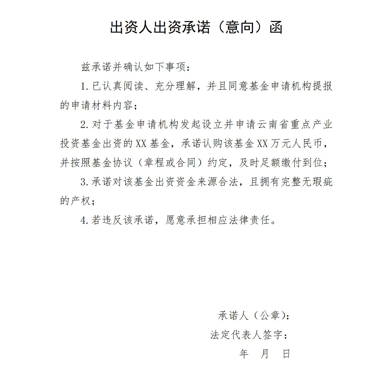 ? ? ??(二)申報事項。各行業(yè)主管部門、地方政府按照《產(chǎn)業(yè)基金申報指南》(見附件)的要求,向云南金控集團(tuán)或其指定的省重點基金管理人提交申報設(shè)立產(chǎn)業(yè)基金文件,包括產(chǎn)業(yè)基金設(shè)立方案、基金管理人情況、基金章程或協(xié)議草案、出資人出資意向及出資能力證明等相關(guān)材料。